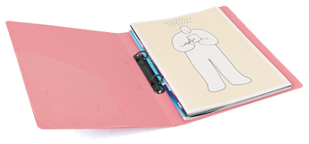 中綴じの変形版。綴じた針金がC字型に飛び出しているため、2穴ファイルに容易に綴じこめる。パンチ穴をあける必要がないのでデザインに制限がない。